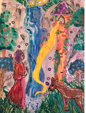 2.1 Kinderrechte - (k)ein Märchen: Anna-Lina Schneidmüller vom Gymnasium Philippinum in Weilburg greift in ihrem fantasievollen Bild das bekannte Märchenmotiv von Rapunzel auf und verwandelt es in eine moderne Erzählung über Freiheit, Selbstbestimmung und die Rechte von Kindern. Die Figur am Fuß des Turms wirkt neugierig und strahlt Offenheit und Mut aus. Durch die liebevoll gestaltete Natur mit dem Reh und den Blumen wird ein geschützter Raum geschaffen, der an das Recht jedes Kindes auf Geborgenheit und ein sicheres Umfeld erinnert. Der Malstil wirkt bewusst verspielt und erzählerisch, sodass die Szene wie ein lebendig gewordenes Bilderbuch erscheint.Das Bild lädt dazu ein, länger hinzusehen und immer neue Facetten zu entdecken. Mit ihrer kreativen Umsetzung zeigt die Fünftklässlerin, wie europäische Märchen genutzt werden können, um wichtige Werte wie Gleichberechtigung und Freiheit sichtbar zu machen.