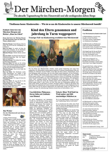 Leon Lenhardt, Ruqiyah Awas, Paulina Mader, Anne Telser hat am 73. Europäischen Wettbewerb mit dem Modulthema: Kinderrechte – (k)ein Märchen? teilgenommen. In der selbstgestalteten Zeitung verbinden die Lernenden märchenhafte Motive mit aktuellen Kinderrechten und schafft durch die klare Gliederung, die lebendige Bildgestaltung und die kreativen Artikel eine eindrucksvolle Gesamtkomposition. Die Mischung aus Nachrichtenstil, Gedicht und Interview verleiht dem Projekt eine besondere, nachdenklich-engagierte Stimmung.