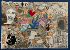 Europa als Anker der Hoffnung. Maya Büttner von der Freiherr-vom-Stein-Schule Fulda (Klasse 9) präsentiert zum Modulthema „Hier bin ich Mensch – hier darf ich sein!“ eine außergewöhnliche Collage, die durch ihre Materialvielfalt und Dreidimensionalität besticht. Das Werk lädt zum Verweilen ein: Zwischen Zeitungsausschnitten, Zeichnungen und kraftvollen Schlagworten gibt es unzählige Details zu entdecken, die den Kontrast zwischen Leid und Freiheit thematisieren. Besonders prägnant ragen die goldenen Sterne hervor, die sich plastisch vom Untergrund abheben und das Zentrum des Bildes wie einen Schutzwall einrahmen. Maya verdeutlicht damit eindrucksvoll, dass Frieden und Menschenrechte in Europa kostbare Privilegien sind, die inmitten globaler Krisen aktiv geschützt werden müssen. Ein handwerklich brillanter und reflektierter Beitrag, der völlig verdient die Bundesebene erreicht hat.