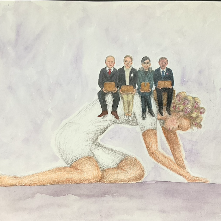 In dieser kraftvollen Darstellung sehen wir eine junge Frau, die von vier Politikern auf ihrem Rücken belastet wird. Ihre Entscheidung, sich nicht von ihnen zu befreien, verdeutlicht die Bequemlichkeit, mit der Macht oft ausgeübt wird. Diese Unterdrückung hindert sie daran, sich zu entfalten und zu wachsen.