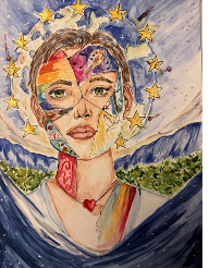 Greta Bargl hat am 73. Europäischen Wettbewerb mit dem Modulthema 3-1 "Hier bin ich Mensch – hier darf ich sein" teilgenommen und sich mit einem eindrucksvollen Beitrag für die Bundesebene qualifiziert. Die Schülerin des Schuldorfs Bergstaße in Seeheim-Jugenheim gestaltet einen Menschen, aus vielen facettenreichen Elementen wie Kunst, Liebe, Vielfalt und Meinungen besteht. In einer klaren, symbolstarken Bildsprache wird sichtbar, wie Europa Raum zur Entfaltung bietet – und wie zerbrechlich diese Freiheit zugleich ist. Die schwebende Erde und der Kreis der Sterne verweisen eindringlich auf gemeinsame Werte, die Halt geben und geschützt werden müssen.