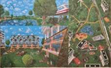 Die Gestaltung besticht durch ihre Vielschichtigkeit: In einer harmonischen Kombination aus Vogelperspektive und Nahansicht visualisiert Leonard eine Stadt, die auf kurzen Wegen, regenerativen Energien und sozialer Gerechtigkeit basiert. Besonders die Details – von der modernen Bahnanbindung über begrünte Gemeinschaftsflächen bis hin zu Orten der kulturellen Begegnung – unterstreichen seine Vision einer inklusiven Gesellschaft. Durch die warme, lebendige Farbgebung vermittelt das Bild Zuversicht und zeigt auf, wie durch Wohngenossenschaften und kluge Stadtplanung ein „Wir-Gefühl“ in Europa wachsen kann. Ein inspirierender Beitrag, der technische Innovation mit tiefem humanistischem Verständnis verbindet.