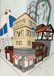 Besonders beeindruckend ist die zeichnerische Präzision und die symbolstarke Komposition: Von griechischen Säulen über deutsches Fachwerkerbe bis hin zu modernen, begrünten Glaskonstruktionen („Skyline“ und „Natur“) verschmelzen die Elemente zu einem lebendigen Ort der Begegnung. Die zentrale Beschriftung „DIVERSITY“ über dem französischen Ladenlokal wird dabei zum Programm. Alisa zeigt eindrucksvoll, dass zukunftsorientiertes Wohnen in Europa dort entsteht, wo Tradition und Moderne aufeinandertreffen und Raum für kulturelle Teilhabe schaffen. Ein visuell fesselnder Beitrag, der die Idee eines „gemeinsamen europäischen Hauses“ architektonisch greifbar macht.