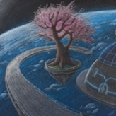 Dieses beeindruckende Werk von Erik Sulzmann zum Thema „Wohnen als Selbstverständlichkeit?!“ eröffnet einen poetischen Blick auf Heimat im kosmischen Maßstab. Auf dem Bild ist ein Teil einer Stadt im Weltall zu sehen, die nach dem Abschmelzen der Pole als neuer Lebensraum für die Bevölkerung errichtet wurde. Inmitten der Weite des Weltalls schwebt eine Insel mit einem blühenden Kirschblütenbaum, den der Zehntklässler der Ricarda-Huch-Schule in Dreieich als Symbol für das Leben, den Tod und den Neuanfang im Zentrum des Bildes platziert. Die zarten Rosatöne der Blüten stehen in berührendem Kontrast zu den tiefen Blau- und Schwarztönen des Universums und verleihen dem Bild eine besondere Strahlkraft. Besonders eindrucksvoll ist die harmonische Verbindung von Natur und Technik, die zeigt, dass nachhaltiges Wohnen ein zentrales Anliegen unserer europäischen Wertegemeinschaft ist.