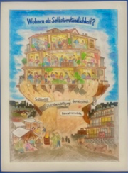 Zornitsa Prodanova stellt in ihrem Bild zum Thema „Wohnen als Selbstverständlichkeit?“ das Haus als schützenden, von starken Händen getragenen Raum dar und macht damit sichtbar, dass Wohnen keine Ware, sondern ein grundlegendes Menschenrecht ist. Die Hände symbolisieren zentrale Werte Europas wie Solidarität, Gleichberechtigung, Gemeinschaft und Menschenwürde und zeigen die Verantwortung der Gesellschaft. Die warme, leuchtende Farbgebung im Inneren des Hauses vermittelt Geborgenheit, Hoffnung und Zusammenhalt, während die dunkleren Töne im unteren Bildbereich soziale Ungleichheit und Ausgrenzung eindrucksvoll kontrastieren. Mit großer Sensibilität zeigt die Schülerin der 11. Jahrgangsstufe der Ricarda-Huch-Schule in Dreieich unterschiedliche Lebensrealitäten: gemeinschaftliches Miteinander im Haus und existenzielle Not am Rand der Gesellschaft. Diese Gegenüberstellung zeugt von einem reifen Blick auf gesellschaftliche Verantwortung und von bemerkenswerter Empathie. Die detailreiche Gestaltung der einzelnen Räume lädt dazu ein, innezuhalten und das Zusammenleben in all seiner Vielfalt zu entdecken. Gleichzeitig stellt das Bild eine kritische Frage an uns alle und fordert dazu auf, europäische Werte aktiv zu schützen und zu leben.