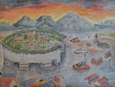 Elisa Schneider vom Schuldorf Bergstraße in Seeheim-Jugenheim (Jahrgang 12) widmet sich in ihrem Beitrag einer der drängendsten Fragen für das Europa der Zukunft: Wie wohnen wir sicher in Zeiten des Klimawandels? Mit einer beeindruckenden Vision reagiert sie künstlerisch auf die Bedrohung durch steigende Meeresspiegel und zunehmende Naturkatastrophen. Die gestalterische Besonderheit liegt in der harmonischen Darstellung einer schwimmenden, autarken Stadtlandschaft. In sanften Aquarelltönen fängt Elisa eine Atmosphäre ein, die trotz der ernsten Thematik Hoffnung ausstrahlt. Ihr Entwurf integriert innovative Lösungen zur Energiegewinnung direkt in den Lebensraum und schafft eine schützende, kreisförmige Struktur, die Gemeinschaft und Sicherheit bietet. Besonders faszinierend ist der Kontrast zwischen der weiten Wasserlandschaft und den funktionalen, nachhaltigen Wohnmodulen im Zentrum. Ein zukunftsorientierter und technisch reflektierter Beitrag, der zeigt, dass Architektur die Antwort auf ökologische Herausforderungen sein kann.