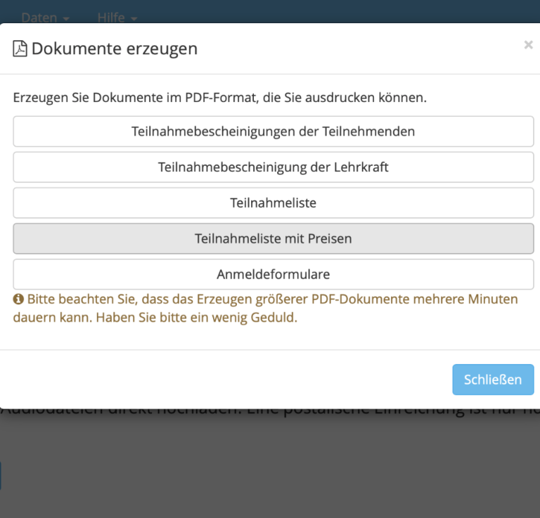 Danach auf Teilnahmebescheinigung der TN klicken.